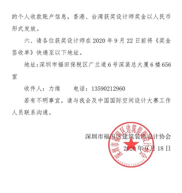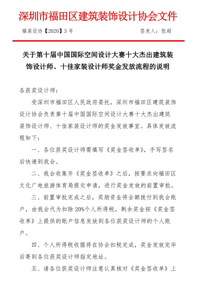 關(guān)于第十屆中國國際空間設(shè)計大賽十大杰出建筑裝飾設(shè)計師、十佳家裝設(shè)計師獎金發(fā)放流程的說明